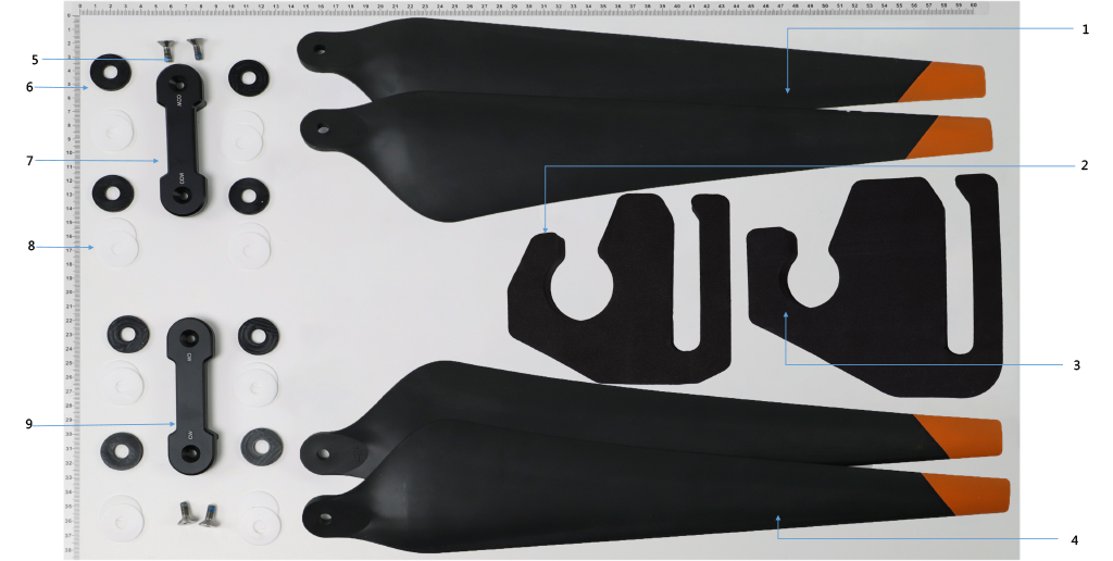 | T30 Propeller | Q1. Propeller (CCW, 1 Pair), Q2. Propeller Holder (Small), Q3. Propeller Holder (Large), Q4. Propeller (CW, 1 Pair), Q5. M50-HF01200100-116036-5103-Y, Q6. R3185 Propeller Adapter Rubber Pad, Q7. Propeller Adapter (CCW), Q8. Arm_R3185 Propeller Adapter Teflon Pad, Q9. Propeller Adapter (CW) |