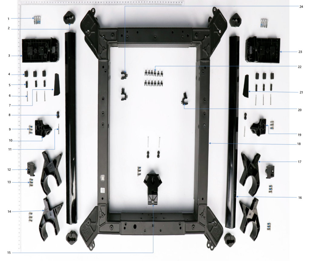 T25 Middle Frame | C1. Screw M40-HC01400140-070039-0003-Y, C2. Cable Tube Rubber Stopper, C3. Battery Supporting Piece (Right), C4. Battery Fixing Piece_External Roller, C5. Spray Tank Fixing Piece_Internal Roller, C6. Spray Tank Fixing Piece_Roller Shaft, C7. Battery Supporting Piece Patch (Right), C8. Weighing Sensor Bracket Roller, C9. M40-HC01000100-072028-5103-N_01, C10. Weighing Sensor Bracket (Right), C11. Spray Tank Fixing Piece_Roller Shaft, C12. Anti-Collision Pad, C13. Screw M40-HC01400140-070039-0003-Y, C14. Aircraft Arm Fixing Piece (Right), C15. Weighing Sensor Bracket (Front), C16. Cable Tube, C17. Aircraft Arm Fixing Piece (Left), C18. Aircraft Frame Module, C19. Weighing Sensor Bracket (Left), C20. Hose Clip, C21. Battery Supporting Piece Patch (Left), C22. Load Sensor Cable Clip, C23. Battery Supporting Piece (Left), C24. Cable Clip |