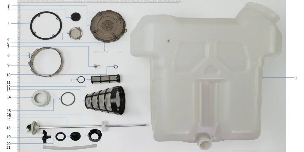 T30 Spray Tank | F1. Spray Tank, F2. Spray Tank_Spray Tank Upper Cover, F3. Spray Tank_Spray Tank Cover Sealing Pad, F4. Spray Tank_Spray Tank Cover Sealing Pad, F5. Spray Tank_Cover Ventilation Locking Cover, F6. Spread Tank Lanyard, F7. Float Locating Rod, F8. M30-HC02050080-070020-5103-Y_01, F9. Spray Tank_Spray Tank Cover Ring, F10. Float Locating Rod Sealing Ring, F11. Spray Tank_Filter Rubber Ring, F12. Filter With 100 Holes, F13. Spray Tank Inlet Filter, F14. Float Cover, F15. Float Cover Sealing Ring, F16. Spray Tank Outlet Cover, F17. Spray Tank Outlet, F18. Liquid Level Meter Module, F19. Spray Tank Y-tee Part, F20. Spray Tank Outlet Sealing Pad, F21. Spray Tank_Spray Tank Connection Hose |