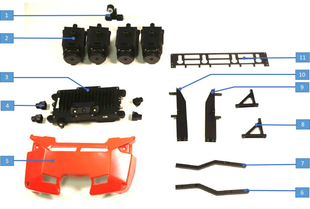 T16 Front Frame 2 | D1. Pump_Water Distribution Y-tee Part, D2. Pump 1.0, D3. T16 Avionics Module(TH), D4. Avoinics_Antenna Connector Fixing Piece_01, D5. Avionics Protection Cover, D6. Pump_Mounting Braket(Left), D7. Pump_Mounting Braket(Right), D8. Pump_Triangle Bracket, D9. Avionics Fixing Bracket (Right), D10. Avionics Fixing Bracket (Left), D11. Pump_Mounting Carbon Board |