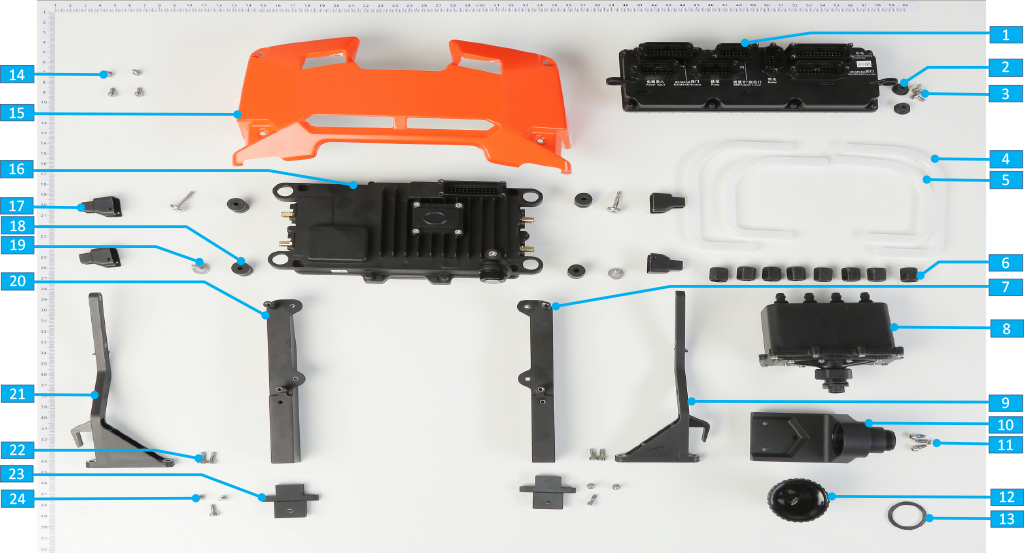 T20 Front Frame2 | E1. Spraying Board Module, E2. Insulated Rubber Base, E3. M30-HC00980050-080020-5102-Y, E4. 4-Channel Flow Meter U-shaped Tube (Long), E5. 4-Channel Flow Meter U-shaped Tube (Short), E6. Connector Nut, E7. Aerial-Electronics Bracket (Right) (Die Cast), E8. 4-Channel Electromagnetic Flow Meter, E9. Delivery Pump Bracket (Right), E10. Spray Tank Base Plug Port Bottom Base, E11. M30-HC080080-55-85, E12. Spray Tank Base Plug Port (Round Ridged Base), E13. Spray Tank Base Filter Sealing Ring, E14. Arm Screw, E15. Avionics Protection Cover, E16. Aerial-Electronics Module (CN), E17. Avionics_Antenna Port Fixing Piece, E18. Avionics_Shock Absorption Rubber, E19. M30-HT01930060-110025-5103-Y, E20. Aerial-Electronics Bracket (Left) (Die Cast), E21. Delivery Pump Bracket (Left), E22. M40-HC01000100-072028-5103-N_01, E23. Front Airframe Carbon Tube Reinforced Fixing Piece, E24. M30-HC080080-55-85 |