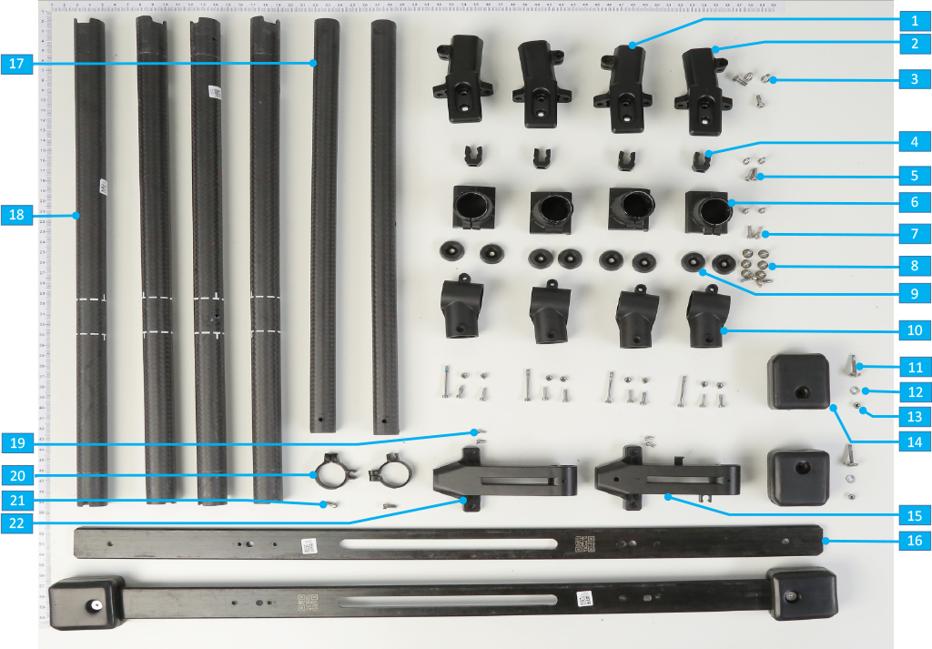 T20 Landing Gear | D1. Landing Gear Supporting Rod (Front Left/Rear Right), D2. Landing Gear Supporting Rod (Front Right/Rear Left), D3. M40-HC01000100-072028-5103-N_01, D4. Hose Clip 2, D5. Arm Screw, D6. Fiberglass Board Connector (Front Right/Rear Left), D7. Arm Screw, D8. Screw M30-HPW01200100-090025-5103-Y, D9. Landing Gear_Cushion Pad, D10. Radar Fixing Rod Connector, D11. M30-HT01930060-110025-5103-Y, D12. Riveting Pad, D13. M3 Nut, D14. Landing Gear Fiberglass Rubber Damping Piece, D15. Radar Fixing Bracket (Front), D16. Landing Gear Bottom Fiberglass Board, D17. Landing Gear Crossbeam (Radar Fixing Pole), D18. Landing Gear Vertical Rod, D19. M25-HC060060-45-85, D20. Pump_Landing Gear Buckle, D21. M30-HC080080-55-85, D22. Radar Fixing Bracket (Rear), D23. M30-HC02800070-055030-0003-Y |