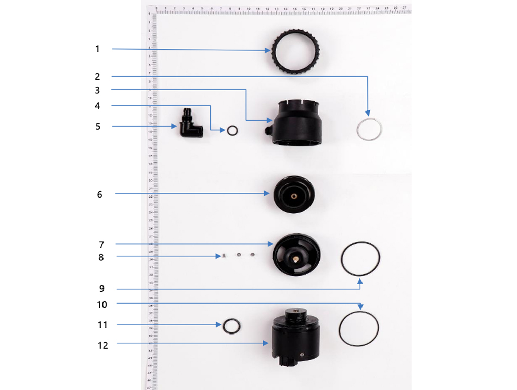 T40 Impeller Pump | M1. Water Outlet Rotation Cover, M2. #N/A, M3. Impeller Pump Shell, M4. Pump_Connector Sealing Ring, M5. Impeller Pump Curving Connector, M6. Impeller, M7. Impeller Pump Spacing Sleeve, M8. M25-PF00500035-047015-5103-N, M9. Pump Sealing Ring, M10. Motor Sealing Ring, M11. Centrifugal Valve Rubber Pad, M12. Impeller Pump Motor |