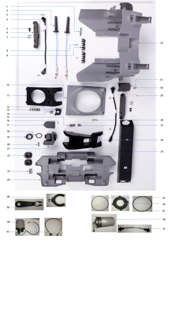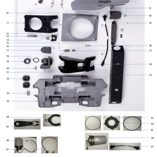 T50 Front Frame | B1. Screw M30-HC060060-55-85, B2. SDR Antenna (Front), B3. Screw M25-HC00780040-040020-5108-N, B4. Forward Vision Sensor Signal Cable, B5. Damping Silicone Rubber, B6. Forward Vision Sensor Module (Incl. Signal Cable), B7. M30-HC01450080-100020-5103-Y, B8. T30-HC00800080-057030-5103-N, B9. RF Cable Clip, B10. Top Cover of Front Shell, B11. Forward Radar Bracket, B12. FPV Camera Bracket Supporting Piece, B13. Screw M40-HC01400140-070039-0003-Y, B14. M40-HC01000100-072028-5103-N_01, B15. M40-HC01000100-072028-5103-N_01, B16. M20-PC00400040-040010-5103-Y, B17. Auxiliary Arm, B18. Lens Cap Sealing Gasket, B19. Lens Cap Module, B20. Screw M30-HC060060-55-85, B21. FPV Camera Module, B22. Front Shell Sealing Stopper, B23. M40-HC01400140-070039-4105-Y, B24. Front Shell Bottom Plate, B25. Front Frame Aluminum Tube, B26. FPV Camera Bracket, B27. M40-HC01000100-072028-5103-N_01, B28. Screw M30-HC060060-55-85, B29. Binocular Vision Sensors Sealing Ring, B30. Screw M30-HC060060-55-85, B31. Outer Shell Side Cover, B32. Front Shell Module, B33. Radar Sealing Ring, B34. Forward Radar Base, B35. Radar Base Sealing Ring, B36. Front Radar Module, B37. Forward Radar Signal Cable, B38. Radar Left Supporting Piece, B39. Radar Right Supporting Piece, B40. Rear Radar Module, B41. Rear Vision Radar Signal Cable |