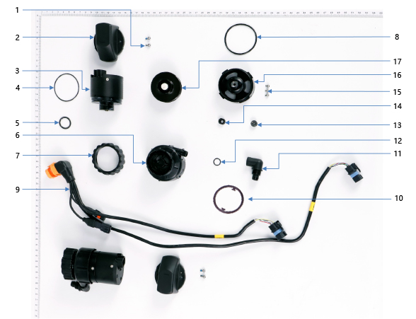 T50 Impeller Pump | J1. Screw M30-HC060060-55-85, J2. Impeller Pump Protective Hood, J3. Impeller Pump Motor, J4. Motor Sealing Ring, J5. Centrifugal Valve Rubber Pad, J6. Impeller Pump Shell, J7. Water Outlet Rotation Cover, J8. Pump Sealing Ring, J9. Spraying Signal Cable, J10. Y-tee Part Sealing Pad, J11. Impeller Pump Curving Connector, J12. Pump_Connector Sealing Ring, J13. Anti-Wear Gasket, J14. Damping Pad, J15. Screw M25-HC00400040-050020-0003-N, J16. Impeller Pump Spacing Sleeve, J17. Impeller Pump Module |