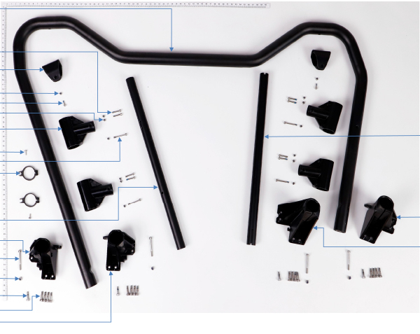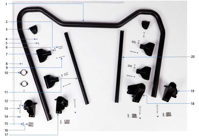 T50 Landing Gear | E1. Landing Gear Aluminum Tube, E2. Screw M30-HC1880-55-85, E3. Landing Gear Bottom Rubber Pad, E4. M3 Nut, E5. Screw M30-HC100100-55-85, E6. M3 Nut, E7. Landing Gear Y-tee Part, E8. T30-HC01000100-057030-0323-N, E9. Screw M30-HC02800070-055030-0003-Y, E10. Landing Gear Cable Clip, E11. Landing Gear Crossbeam (Rear), E12. Landing Gear Fixing Piece (Rear Right), E13. Screw (M40-HC03500120-070040-5103-N), E14. M4 Stainless Locknut, E15. Screw (M40-HC01510056-070039-5103-Y), E16. Screw (M40-HC01510056-070039-5103-Y), E17. Landing Gear Fixing Piece (Rear Left), E18. Landing Gear Fixing Piece (Front Left), E19. Landing Gear Fixing Piece (Front Right), E20. Landing Gear Crossbeam (Front) |