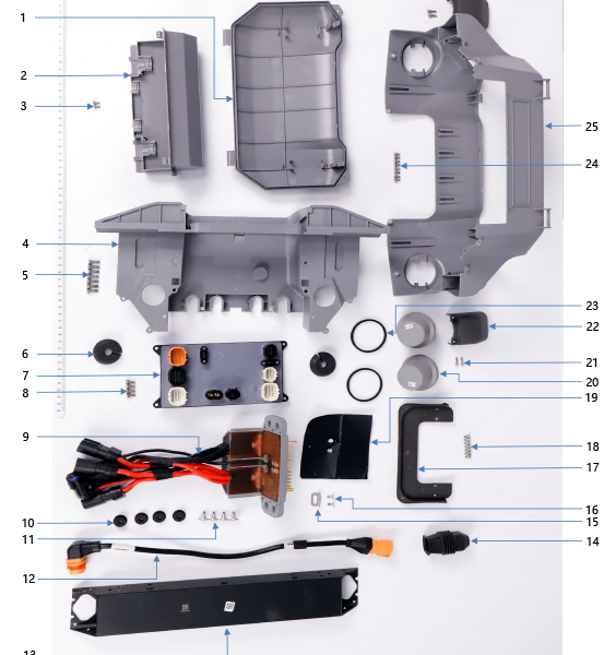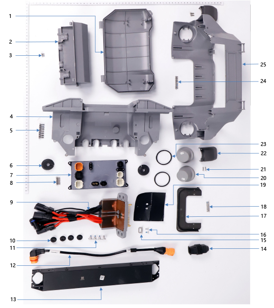 T50 Rear Frame | D1. Rear Cover of Rear Shell, D2. Lower Cover of Rear Shell, D3. Screw M30-HC060060-55-85, D4. Rear Shell Bottom Plate, D5. M40-HC01000100-072028-5103-N_01, D6. Rear Shell Sealing Stopper, D7. Spraying Power Module, D8. M40-HC01000100-072028-5103-N_01, D9. Power Distribution Board Module, D10. Damping Pad, D11. Screw (M30-HC01150050-120020-5103-Y), D12. Spraying Adaptive Cable, D13. Rear Frame Aluminum Tube, D14. Adaptive Cable Rubber Sleeve, D15. Battery Buckle, D16. Screw (M30-HC100100-55-85), D17. Power Distribution Board Waterproof Cover, D18. Screw (M30-HC00550045-055012-5103-Y), D19. Glue Baffle Plate, D20. RTK Antenna Module, D21. Screw M30-HC060060-55-85, D22. Outer Shell Side Cover, D23. RTK Rubber Ring, D24. Screw M30-HC060060-55-85, D25. Rear Shell Module |